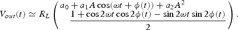 $$ \hskip-14pt {V_{out}}(t) \simeq {R_L}\left( \matrix{{a_0} + {a_1}A\cos (\omega t + \phi (t)) + {a_2}{A^2} \hfill \cr \quad \displaystyle{{1 + \cos 2\omega t\cos 2\phi (t) - \sin 2\omega t\sin 2\phi (t)} \over 2} \hfill} \right).$$