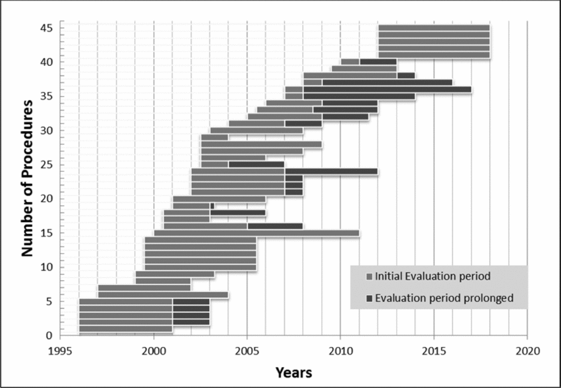 The evaluation time ranged from 1.5 years to 11 years. Mean evaluation time for the initial evaluation period without prolongation was 4.5 years (median 5 years) and 5.8 years (median 6 years) for the total evaluation period including prolongation. Figure 1 shows a longitudinal sequence of the forty-five medical technologies in the category “yes, in evaluation.” The graph also shows that the instrument was used more frequently before 2004 than thereafter.