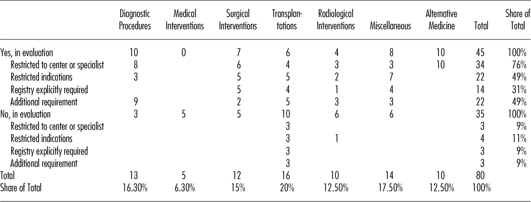 Forty-four of forty-five procedures in the CED regime are subject to further restrictions. Table 1 shows that these can be “restrictions to a center or a specialist” (34; 76 percent technologies), “restricted indications” (22; 49 percent technologies.), “registry explicitly required” (14; 31 percent technologies), or “additional requirements” (22; 49 percent technologies). Altogether, for fourteen of forty-five interventions, a registry was explicitly required. It is of interest to note that this additional request primarily related to surgical interventions (5 of 7) and transplants (4 of 6).