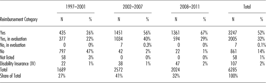A total of thirty-five technologies (29.2 percent) of the 120 technologies were classified “no, in evaluation” during the same period of time (Table 1). The most frequent technologies in the “no, in evaluation” category were transplants (n = 10) followed by radiological (n = 6) interventions. This category was initially introduced to signal to the providers of those health technologies that they had a realistic chance to get reimbursement at a later stage if they could provide better evidence. Due to the fact that no reimbursement was provided for technologies in this category, it was difficult for the authorities to monitor and enforce the necessary evidence-generation. Only two of these thirty-five decisions were, upon re-evaluation, turned into “yes, in evaluation.” Both relate to hematopoietic stem cell transplants for autoimmune diseases. Thus, the category “no, in evaluation” was abandoned in 2004, although this was never officially communicated. Since that year, no new such decision has been made. Some of the technologies, however, that were classified “no, in evaluation” before that year were still listed in the appendix of the procedure ordinance with that label in the year 2013.