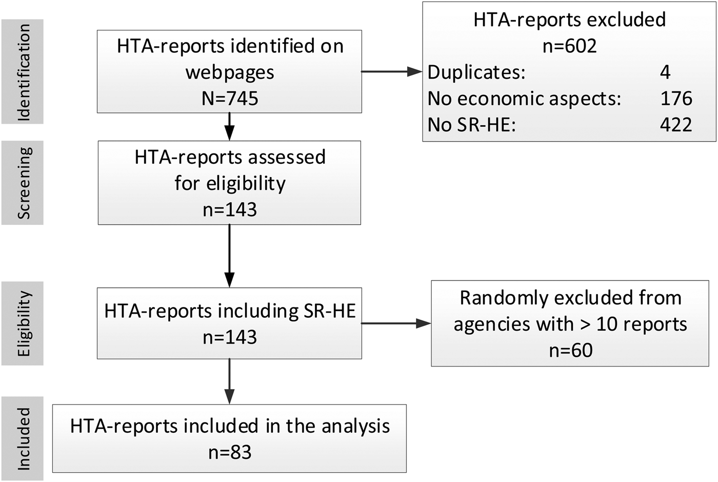 We used the publicly accessible member lists of the International Network of Agencies for Health Technology Assessment (INAHTA), of Health Technology Assessment International (HTAi), and the European Network for Health Technology Assessment (EUnetHTA) to identify HTA agencies (available on http://www.inahta.org/, https://www.htai.org/, and http://www.eunethta.eu/, request date June 22, 2016). Between July 2 and August 22, 2016, we searched the Web pages of all 115 member organizations for HTA-reports published since January 2015. We then manually screened the list of published HTA reports of each of the agencies. We used this timeframe to show a current overview of the methods applied for SR-HEs. We also considered reports of joint assessments by EUnetHTA published within that time span. Inclusion criteria were as follows (see Supplementary Table 1 for further explanation): (i) publication type: inclusion of reports that evaluated a health technology to inform medical decision making; (ii) assessment includes a SR-HE: HTA-reports that described economic aspects of the technology under assessment and had conducted a literature review of economic evaluations in at least one database; (iii) language: inclusion of reports written in English, German, French, or Spanish