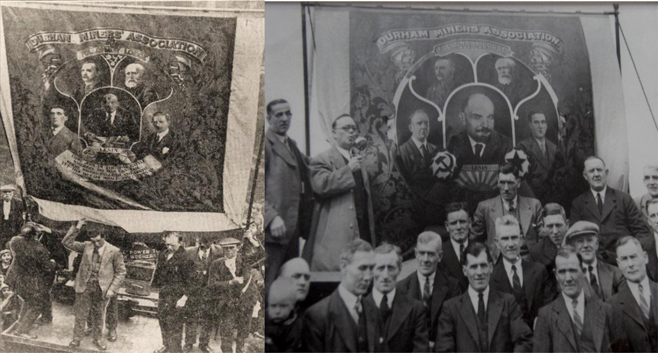 The 1928 Follonsby miners’ banner was the third of three red Durham miners’ banners of the interwar period (discussed further below). On the banner's front were five portraits: the centerpiece was Lenin, with a scroll underneath emblazoned with his name. Below Lenin was a line from William Morris’ poem “The Day is Coming”: