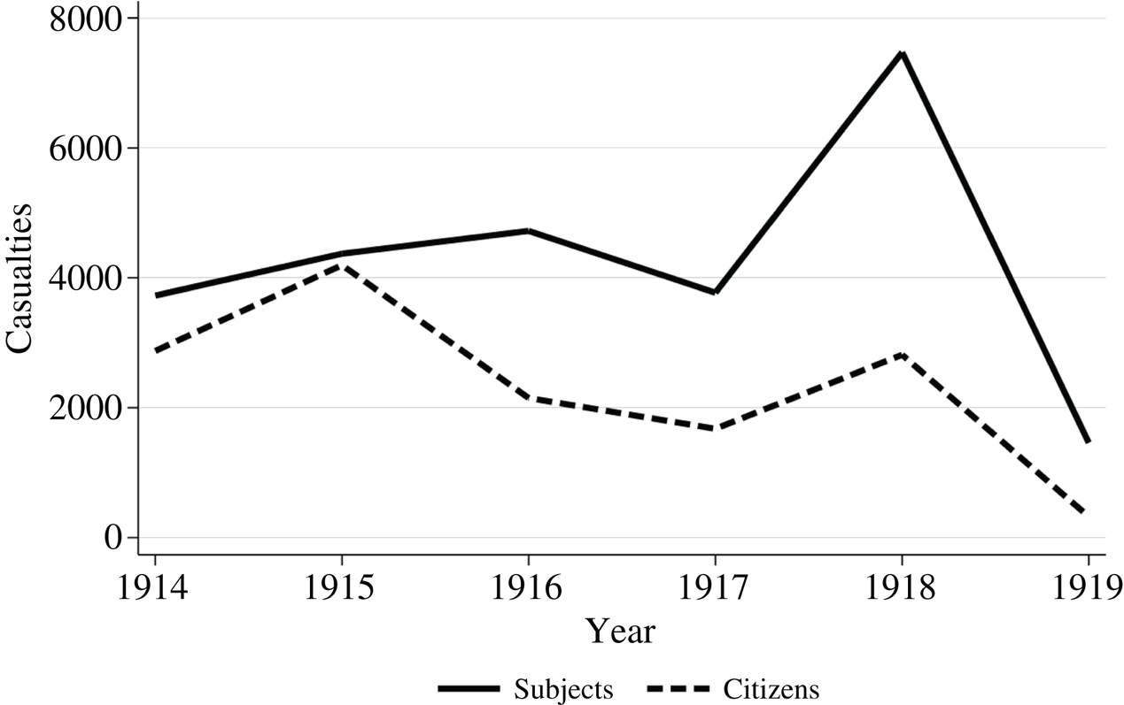 Second, the introduction of compulsory military service for Algeria's subjects made the burden of military service much more evenly distributed in Algeria than in any other part of the French Empire.Footnote 38 Figure 1 shows the losses that Algerian-born troops suffered immediately following mobilization: more than 6,000 died between August and December 1914 alone. By the end of the war, more than 40,000—about 1 percent of the total estimated population in 1911—would perish. Because citizens were a small share of the total population of Algeria, these casualties constituted a larger share of the community of French citizens in Algeria. By 1919, almost 2 percent of Algeria's French citizens had been killed in combat, compared to about 0.5 percent of all subjects. This shared war burden in Algeria allows us to isolate the subject disadvantage and the fundamental differences in bargaining power between citizens and subjects.