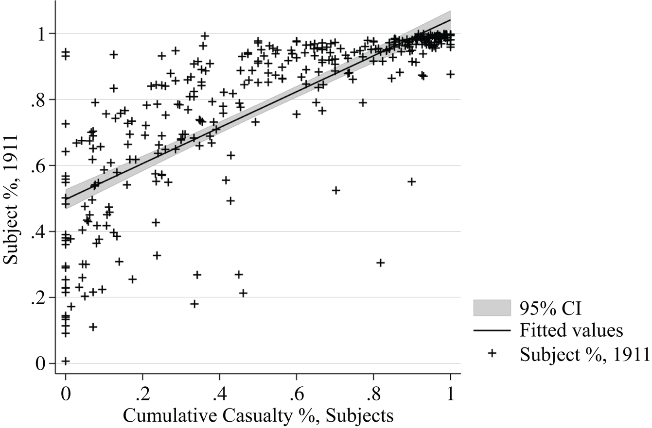 Figure 2 illustrates the positive association between the cumulative share of subject casualties in 1919 and the local share of subjects in 1911. Because this association is strong but not perfect (ρ = 0.77), we include the 1911 subject share of population in the regression to “net out” the effect of the subject penalty following mobilization.