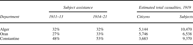 First, the mobilization of colonial troops by imperial powers during World War I was unprecedented.Footnote 35 Although there was significant variation in the degree to which various French colonies contributed to the war effort, Algeria's distinct administrative status, its proximity to France, and the extension of conscription to male Muslims in 1912 ensured that Algeria's subjects experienced mass mobilization in ways not dissimilar to French citizens in Algeria or the metropole.Footnote 36 For every Algeria-born French citizen who died in the war, almost two Algerian subjects gave their lives as well. This figure compares to approximately one citizen for every sixteen subjects in neighboring Tunisia and a staggering one citizen for every 100 subjects in French Sudan (now Mali), the second- and third-largest contributors of colonial troops in World War I after Algeria.Footnote 37