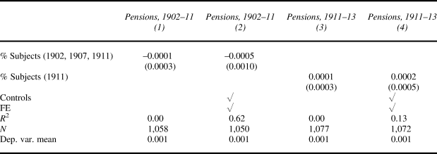 What about disparities in the share of subjects and spending on pensions or public assistance prior to 1914? Table 2 shows the association of our main outcomes prior to mobilization for World War I and the subject share of the population. Because we observe the subject share of the population in only 1902, 1907, and 1911, we use two different approaches in testing for pre-trends. First, we construct a panel using only these three years. Second, we separately examine the three-year period prior to the outbreak of World War I; we observe population data in 1911 but lack population data in 1912 and 1913. In both cases, we find no association between the share of subjects and the share of the budget devoted to pensions, with or without the inclusion of fixed effects.