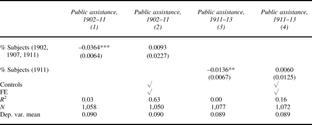 Table 3 repeats the same approach for the public-assistance outcome. An increase in the subject share is associated with lower rates of public assistance spending if we do not include controls (columns 1 and 3). This association is significant for both the 1902–11 (column 1) and 1911–13 (column 3) subsets, but is no longer significant once we include year and administrative fixed effects (columns 2 and 4).Footnote 78 These results increase our confidence that prior to the war the local subject share of the population was not associated with higher or lower rates of spending in terms of pensions or public assistance, despite the association between subject share and the geographic and administrative confounders.Footnote 79