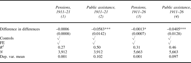 Our main specification focuses on a narrow window of time: 1911 to 1921 (from three years before hostilities to three years after). This narrow bandwidth affords us greater confidence that the differential effects in welfare spending stem from mobilization. Given the fiscal pressures the French state confronted during the war, we next investigate whether the effect of the subject penalty was temporary or endured after armistice. To do so, we extend our bandwidth to 1926, the last year prior to the enactment of legislation that reformed pension schemes. Columns 3 and 4 show that the wartime-induced disparities persisted twelve years after mobilization. We can see that the estimated effect of the subject penalty is larger for pension spending (about 0.1 percent) and weakly significant, and slightly attenuated (but still negative and strongly significant) for public assistance spending relative to the results presented in Table 4. We interpret these results as consistent with the idea that the subject disadvantage continued to influence local spending more than a decade after the initial mobilization for World War I.