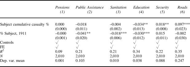 Because our outcomes are measured as shares, columns 3 to 6 examine whether local communes were simply prioritizing other areas of expenditure during the war years. Column 3 suggests that communes with a greater share of subjects faced a similar political disadvantage when it came to spending on sanitation. Column 4 suggests that disadvantage also existed for education spending, and this disparity was compounded as the share of subject casualties increased over time. Columns 5 and 6 provide some sense of the areas of the budget that local authorities prioritized instead. As the share of subject casualties increased, so did spending on the police and road construction.