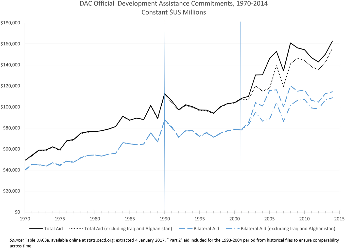 A focus on lessening spillovers from underdevelopment does not imply that donors forego using aid for geostrategic purposes. Donors can engage other strategic priorities without sidelining development by increasing overall aid flows. The evidence suggests that this has occurred. Aid commitments from OECD countries have risen markedly in the post-2001 period. Figure 1 shows aid commitments from members of the Development Assistance Committee (DAC) of the OECD from 1970 to 2014 for both total aid (including contributions to multilateral institutions) and the bilateral portion of their aid, with dotted lines indicating commitments excluding those to Iraq and Afghanistan. Even excluding increases in aid resulting from the large commitments to these two countries, total aid commitments increased by 50 percent from 2000 to 2014, from $104 billion to $156 billion, despite significant volatility in the wake of the global financial crisis. The post-2001 trend was not driven by only a few donors; Austria, Belgium, Finland, France, Ireland, Italy, the Netherlands, New Zealand, Spain, Sweden, the United Kingdom, and the United States all recorded aid increases of more than 50 percent between 2001 and 2006, with some (but not all) declining after the onset of the financial crisis.Footnote 38