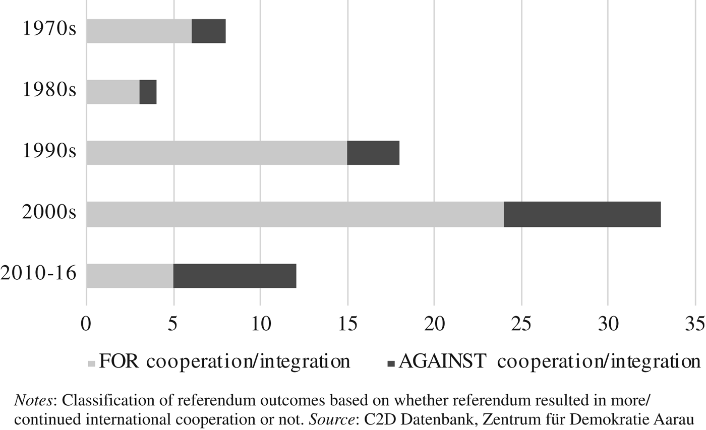 Such negative outcomes of referendums on international cooperation are not a new phenomenon. From the 1972 rejection of EC membership by Norwegian voters to the 2016 rejection of the EU-Ukraine accession agreement by Dutch voters, efforts to establish or deepen international cooperation have failed time and again at the polls.Footnote 2 However, a closer look reveals that noncooperative referendum outcomes have become both more frequent and more disruptive in recent years. Figure 1 lists all national referendums on questions concerning international cooperation from the 1970s until today and shows that the share of referendums that resulted in a rejection of more or continued cooperation has markedly increased in recent years.