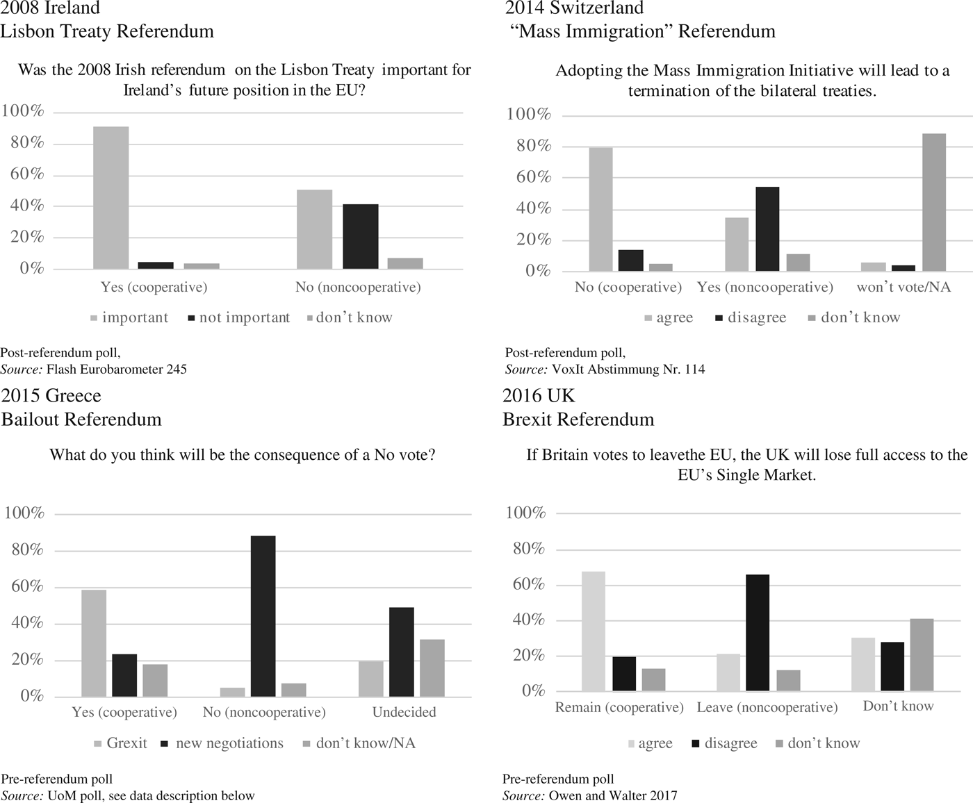 Figure 2 illustrates the wide divergence of expectations about the likely consequences in four recent foreign policy referendums with relatively large spillover effects abroad: the 2008 Lisbon Treaty ratification referendum in Ireland, the 2014 Swiss referendum “Against Mass Immigration,” the 2015 Greek bailout referendum, and the 2016 “Brexit” referendum on EU membership. In all four referendums, expectations about the consequences of a noncooperative vote diverged widely between voters favoring and opposing cooperation. In each case, voters in favor of new or continued cooperation assessed the likely international responses associated with the noncooperative referendum outcome (resisting further integration in the Irish case, defying compliance with an existing arrangement in the Greek case, and reversing existing forms of cooperation in the Swiss and British cases) much more negatively than voters opposed to such cooperation.