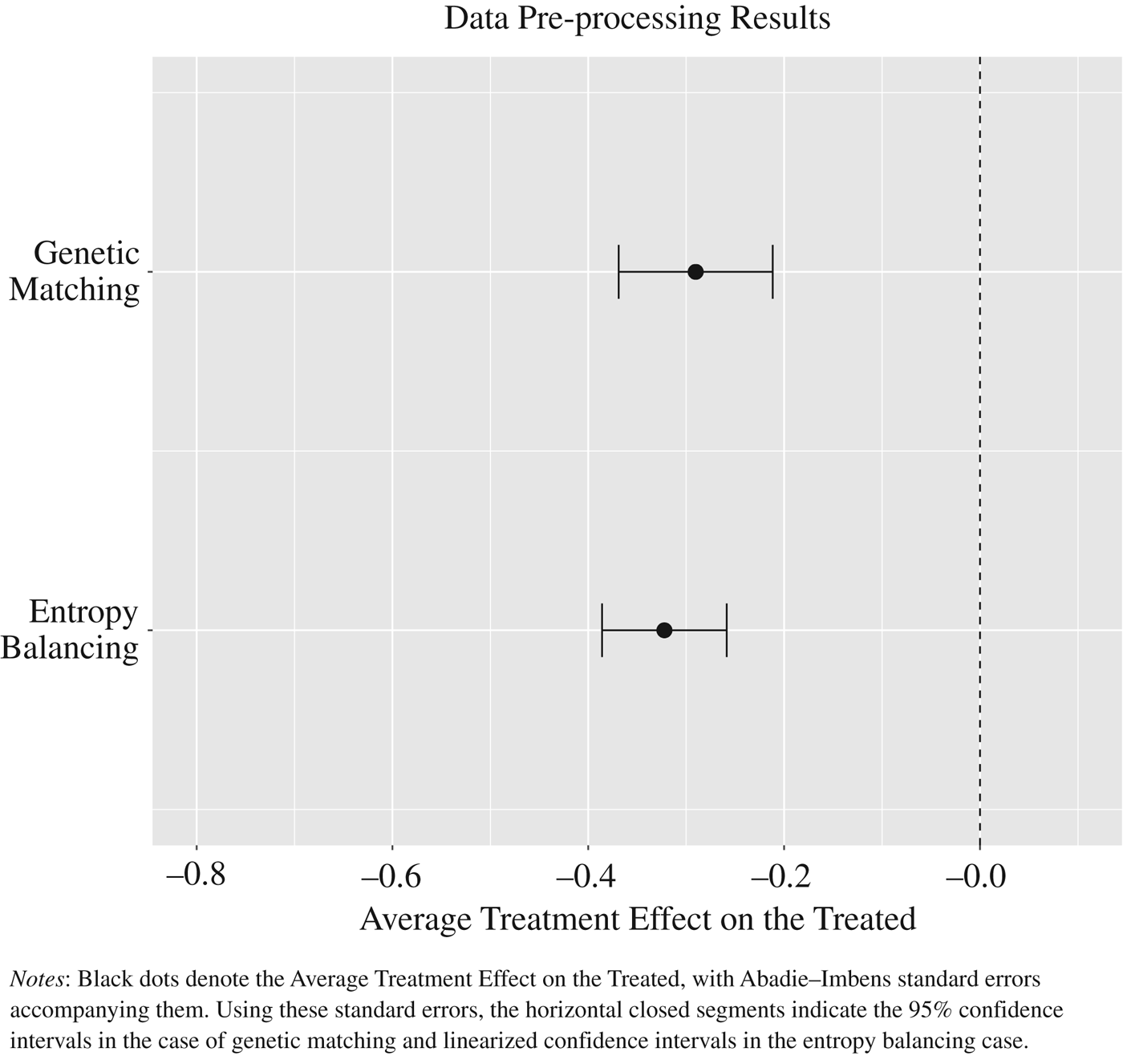 A key issue of concern is, of course, that partisan preferences and expectations are not independent from each other. To examine in more detail whether expectations have an independent effect on vote intentions or whether they are driven by partisanship and other variables such as issue preference, we repeat our analysis using matching analysis. Matching is a method of data preprocessing that allows us to pair “treated” cases with untreated cases along a series of observable characteristics, thus generating a control group which, on the basis of these characteristics, appears very similar to the treated group. This allows us to estimate the treatment effects independent of shared confounders.Footnote 31 In our analysis, this means that each individual who is “treated” with the expectation that a noncooperative referendum outcome will result in Grexit is matched to another individual from our data set who did not expect this outcome (the control category) but who is otherwise almost identical, meaning that s/he voted for the same party, had the same view of the euro, and so on.Footnote 32 Matching analyses thus allow us to compare how different expectations about the consequences of a noncooperative referendum outcome affect the vote intentions among individuals who are almost identical on all other relevant covariates. The advantage of the matching approach is that it not only allows us to evaluate more transparently the degree of similarity in pretreatment covariates between control and treated units, but it is also less model dependent.Footnote 33 We employ two methods of data preprocessing: genetic matching and entropy balancing.Footnote 34 Although there are clear imbalances in the observable characteristics of the two groups in the raw data, including key demographics and the two most obvious attitudinal confounders—partisan preferences and attitudes toward the euro—these differences evaporate after the matching process. The matching process thus creates practically identical treatment and control distributions for all covariates, increasing our confidence in the results.
