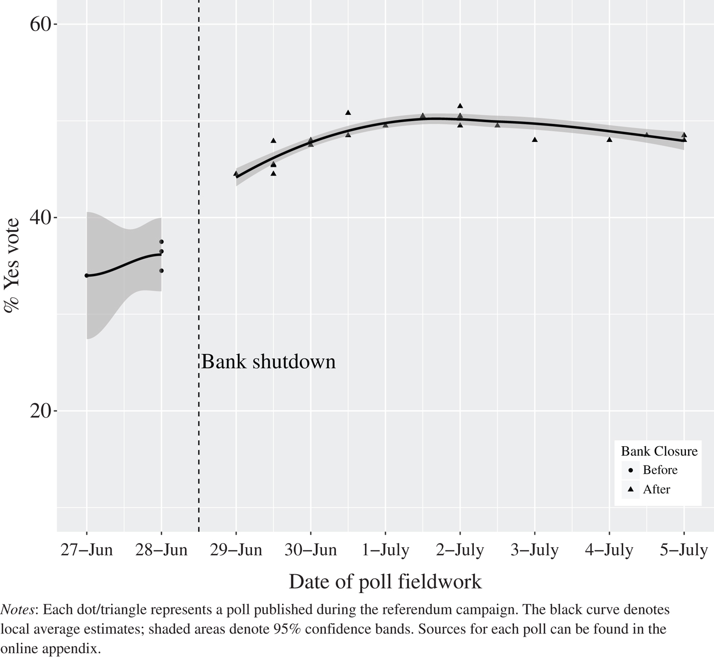 Figure 7. Effect of bank shutdown on average support for bailout proposal (Yes vote) based on 33 polls of referendum vote intention