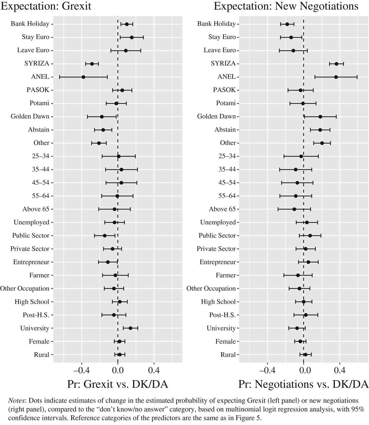 Figure 6 represents the conditional effects of expectations. It displays the change in the predicted probability of voting No as a result of expecting Grexit or new negotiations, respectively, compared to those who are undecided. Consistent with our argument, we find that expectations matter greatly for those who want to stay in the euro. If these voters are convinced that a noncooperative vote will lead to new negotiations, possibly with more leverage for Greece, their likelihood of voting against the bailout package increases by about thirty-eight percentage points. But those who fear that a No vote would result in Grexit, although they want to stay in the eurozone, are twenty-three percentage points less likely to vote against the bailout proposal. In contrast, and as expected, expectations matter much less for those in favor of a return to the national currency.