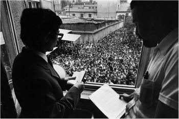 Fig. 2 German officials looking down at potential labour migrants gathered in the courtyard of the German recruitment post in Istanbul, 1972. Photograph: Jean Mohr. DomiD Archive, Cologne. Used with permission.