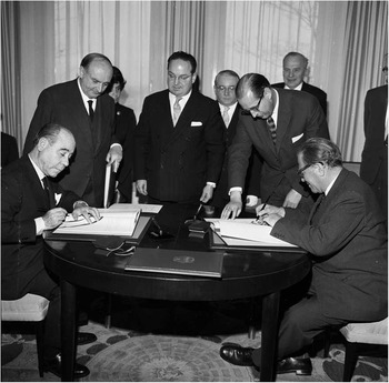 Fig. 1 The Spanish Ambassador Marqués de Bolarque and State Secretary Van Scherpenberg of the German Foreign Office sign the recruitment agreement between Spain and Germany, Bonn, 29 March 1960. Photograph: Rolf Unterberg. Bundesarchiv Bildarchiv, Berlin. Used with permission.