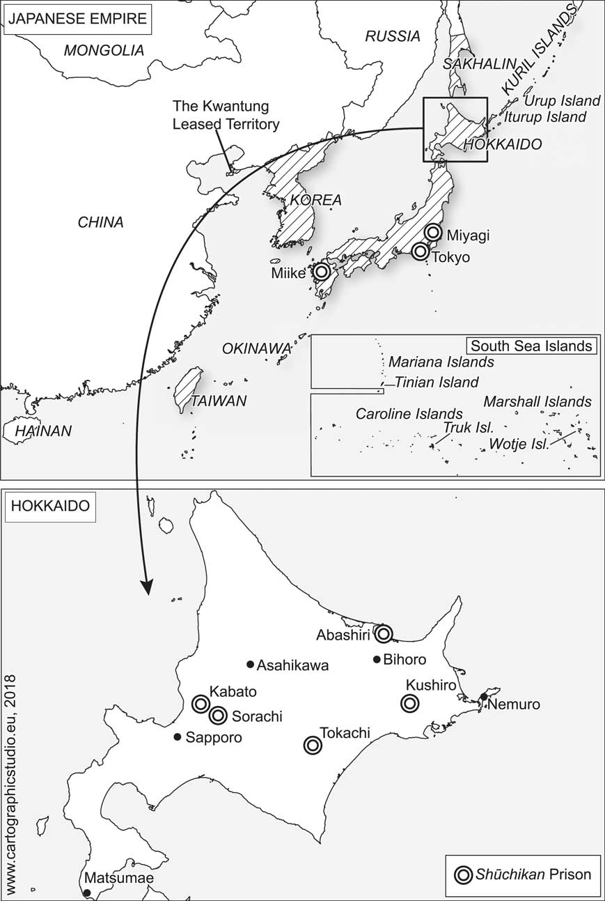 Figure 1 Locations of shūchikan prisons on the Japanese mainland and Hokkaido. Map based on a sketch by the author. Produced with reference to Ramon H. Myers and Mark R. Peattie (eds), The Japanese Colonial Empire, 1895–1945, (Princeton, NJ, 1984), p. 53; Tanaka, Nihon shihonshugi, p. 119.