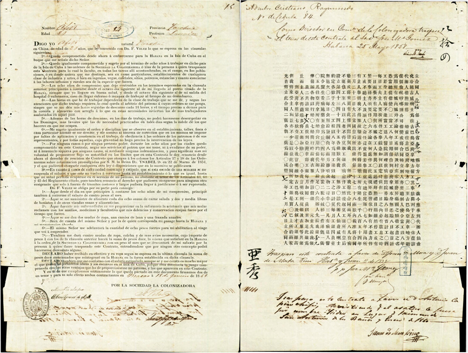 For these men to leave, however, motivation alone was not enough. The mass migration of Chinese people from China to the other side of the world had to happen within a legitimate framework, at least in theory, in order to pass judgement with Qing China and the rest of the world. Under the growing denunciation of slavery, the coolie trade had to be—or at least appear to be—different. To validate the legality of the Chinese indenture operation, a written agreement between the coolie agent and the Chinese indentured labourer laid out the terms and responsibilities for all parties involved. The legally binding agreement stated the names of the contracting parties, employment duration, monthly salary, and benefits, including medical care, accommodation, food allowance, and holidays. A vital clause for the coolies was their supposed liberty upon finishing the contract. This would entail the issuance of a cédula (“滿身紙” in Chinese sources), with which the Chinese worker could gain some degree of physical and employment mobility in Cuba after the eight-year term. The contract also stipulated the nature and location of the work in which the indentured individual was to be engaged. The agreement was to be signed by the two parties (Figure 2).