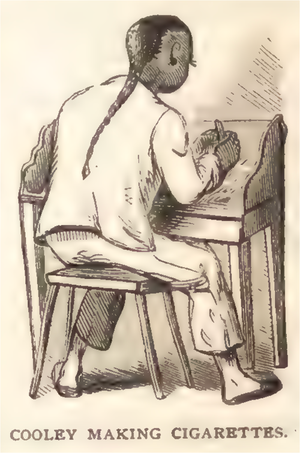 Each workman has a small table to himself, at which he folds, counts, and does up in packages the little cigarettes; and it is astonishing what facility and dexterity they acquire from long practice in handling and counting these small bits of paper. I watched the movements of one whose business it was to enclose twenty-five cigarettes in a package, just as we buy them, and this he did apparently without counting them; and yet by a movement of his fingers he would tell if there was one of two more or less, with surprising accuracy, and apparently simply by the sense of touch. The usher informed me that they rarely or never made a mistake.Footnote 48