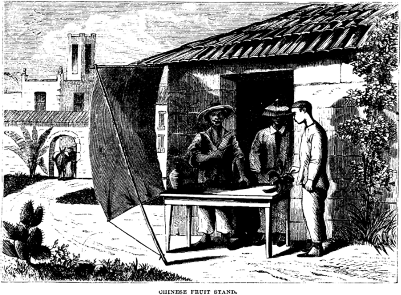 Beyond hard labour, the Chinese were also engaged in the flourishing service sector, particularly in urban areas. Examples included food services, retail commerce, and general hospitality. Bakeries were a popular destination for some who did not get dispatched to the sugar mills. Hu A-ting 胡阿聽 deposed that he toiled for eight years in a Havana bakery and afterwards became a private baker for two years until the local police seized him for the state’s Trocha project (see “For the People and the State” below).Footnote 59After completing their first indenture at sugar plantations, some coolies found more lucrative positions in the service industries. These ex-coolies found jobs in barber shops,Footnote 60liquor stores,Footnote 61butcheries,Footnote 62and fruit stores.Footnote 63Fruit stands operated by the Chinese in Cuba were so noteworthy that Harper’s Magazine found they merited an illustration (Figure 5). The depositions and petitions demonstrate a wide range of professions these Chinese occupied after working at plantations. They all provided essential services to a growing economy.