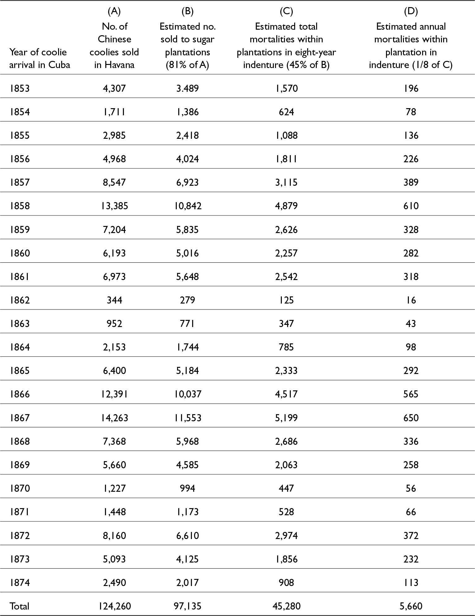 Notes: The number of Chinese coolies sold in Havana is drawn from Pérez de la Riva’s study. The estimated figure of Chinese labourers sold to sugar plantations is based on the 1,176 depositions taken by the Cuba Commission, in which 953 (81 per cent) reported sugar plantations as their first indenture’s workplace. For the estimated number of deaths of Chinese labourers during their typically eight-year contract, I rely on Meagher’s figure of 45 per cent, which appears most reasonable in conventional literature. No reliable year-to-year mortality rate exists. Thus, the annual estimate is calculated using one-eighth of Meagher’s figure. Appendix 3 summarises my calculation of the number of active coolies on sugar plantations during the coolie period.
