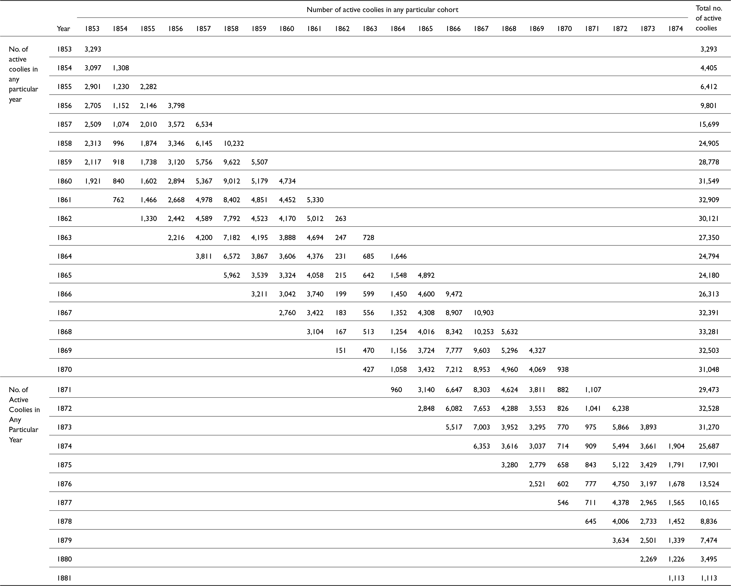 Notes: Although the coolie period spanned from 1847 to 1874, regular shipments of coolies from China to Cuba only began in 1853. The coolie trade effectively ceased in 1874 when the Portuguese authorities in Macau closed the port to the coolie trade. However, Chinese labourers who arrived in Cuba in 1874 were still required to complete their eight-year contracts, meaning the final indentures concluded in 1882. The individual figures in the table represent the number of active coolies after accounting for estimated annual deaths within each relevant cohort (see Appendix 2). For example, in the first row, 3,293 active coolies, all of whom had arrived in Cuba that same year, were working on sugar plantations in 1853. In the second row, by 1854, two overlapping cohorts (3,097 who arrived in 1853 and 1,308 who arrived in 1854) were active on the sugar plantations.