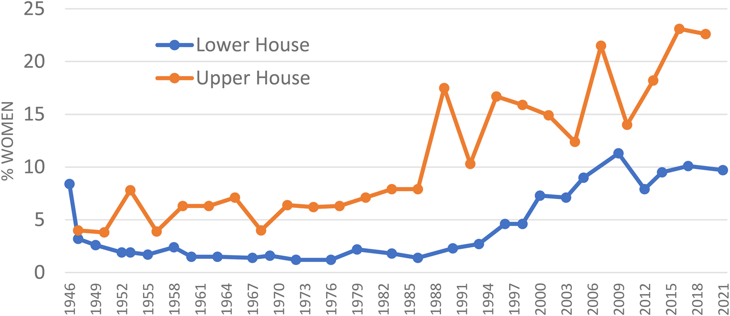Figure 1. Share of women in the lower (Shugiin) and upper house (Sangiin).