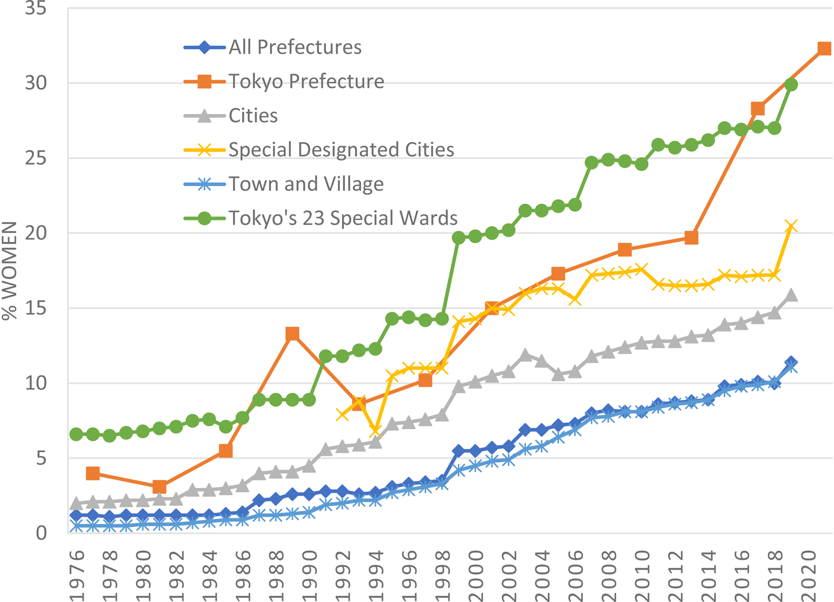 Pharr noted in 1981 that the pattern of female political representation in Japan was the opposite of the USA as the share of women in local assemblies was smaller than the share of women in the Diet. At the aggregate level, this is still true. Figures 1 and 2 show the shares of women in the Diet (Shugiin and Sangiin) and in different local assemblies, respectively. When we compare Figure 1 to the blue diamond-dotted line in Figure 2, we can see that the national average share of women in all local assemblies is lower than the share in the Diet. However, when we go beyond the national average and look at the share of women in different types of local assemblies, a very different picture emerges. Figure 2 shows that the share of women increased much more rapidly in some local assemblies than in others: the more urban the municipality is, the greater the share of female assembly women. The average share of women in city assemblies is several points higher than that in village and town assemblies and even higher in more densely populated large cities (called Seirei Shitei Toshi, Special Designated Cities) relative to smaller cities. Furthermore, the share of women in local assemblies in the 23 Special Wards (Tokubetsu-ku) – the most urban areas of Tokyo – is three times greater than for village and town assemblies. The share of women in the Tokyo Metropolitan Assembly is also three times higher than the average for all prefectural assemblies nation-wide.