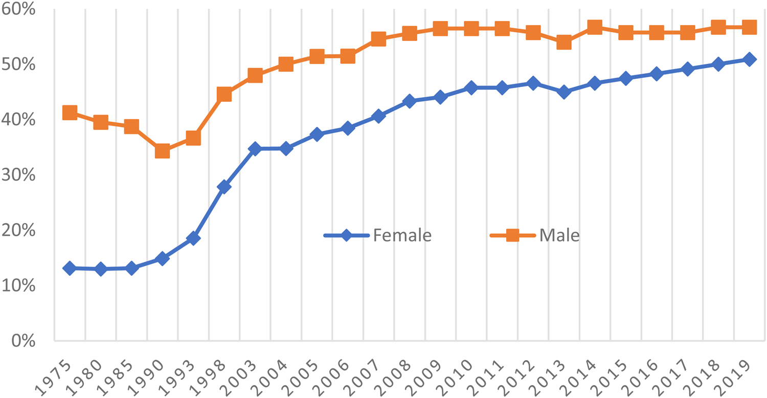 As women increased their educational investment, many of them also delayed or forewent marriage and motherhood. In discussing the gender revolution in the USA, Claudia Goldin (Reference Goldin2006) notes how crucial it was for young women to establish their own identity through their professional experience before becoming mothers. Young women who had established their identity as professionals would try to hold onto their jobs even after marriage and childbirth. While this shift in the USA occurred to women of Hillary Clinton's generation – the generation who came of age during the 1960s – it only occurred to those who came of age after the mid-1990s in Japan. The timing of this shift in Japan explains why both the supply and demand for female politicians increased in the 2000s and 2010s.