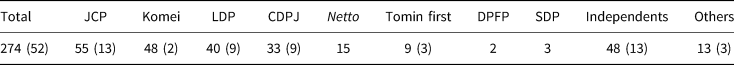 JCP, Japan Communist Party; Komei, Komeito; LDP, Liberal Democratic Party; CDPJ, Constitutional Democratic Party of Japan; Netto, Seikatsusha Nettowa-ku; Tomin first, Tomin first no Kai; DPFP, Democratic Party for the People; SDP, Social Democratic Party.