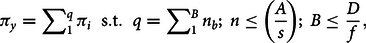 (3) $${\pi _y} = \mathop \sum \nolimits_1^q {\pi _i}\;{\rm{\;s}}.{\rm{t}}.\;\;q = \mathop \sum \nolimits_1^B {n_b};\;n \le \left( {\frac{A}{s}} \right);{\rm{\;}}B \le {\frac{D}{f}},$$