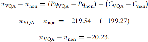 (8) $$\begin{gathered} {\pi _{{\text{VQA}}}} - {\pi _{{\text{non}}}} = (P{q_{{\text{VQA}}}} - P{q_{{\text{non}}}}) - \left( {{C_{{\text{VQA}}}} - {C_{{\text{non}}}}} \right) \\ {\pi _{{\text{VQA}}}} - {\pi _{{\text{non}}}} = - 219.54 - ( - 199.27) \\ {\pi _{{\text{VQA}}}} - {\pi _{{\text{non}}}} = - 20.23. \\ \end{gathered}$$