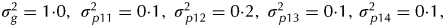 ${\sigma _g^2 = 1 {\cdot} 0,{\kern 1pt} \;\sigma _{\,p11}^2 = 0 {\cdot} 1,\;\sigma _{\,p12}^2 = 0 {\cdot} 2,\;\sigma _{\,p13}^2 = 0 {\cdot} 1,\, \sigma _{\,p14}^2 = 0 {\cdot} 1,}$