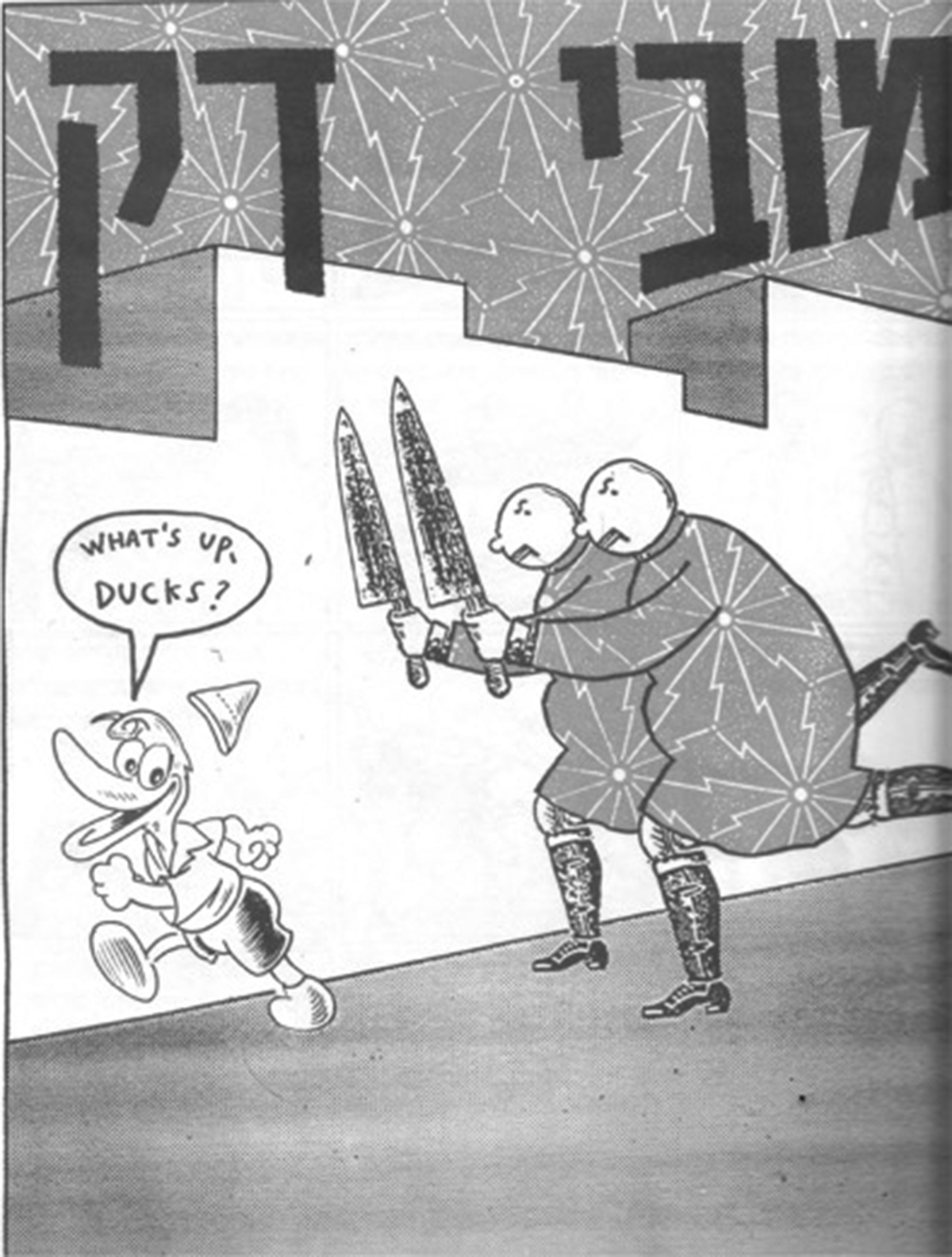 In Understanding Comics, comic artist Scott McCloud defines “icon” as “any image used to represent a person, place, thing, or idea.”Footnote 55 By juxtaposing Donald Duck with Srulik within the “Moby Duck” story, Geva intended to jar the reader through the clash of multiple ideas that had never been mixed before. “Moby Duck,” said Geva,