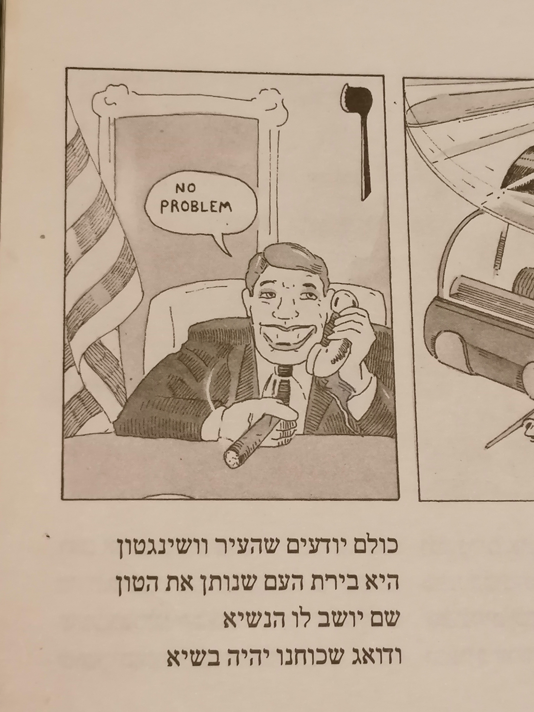 The story begins with Ya'akov Ben Susi receiving a mysterious letter – “I am your rich uncle Shlomo. Come meet me at six.”Footnote 79 The yarmulke-wearing Ya'akov meets his cigar-smoking uncle in a bar, where his uncle tells the boy that he wants to make him “a tempting proposition.”Footnote 80 Two panels forward Ya'akov is already crossing the Atlantic with his newly discovered uncle, raising a toast to “the joint venture” – no yarmulke in sight.Footnote 81 From here on he becomes the brightest star of Wall Street and the toast of Manhattan. His time is spent between a Barbados weekend and an IBM takeover, until, inevitably, “the formerly Yemenite boy receives a phone call from the world's most powerful man.”Footnote 82 Ben Susi now accompanies the President to various global summits, advising him on the most critical matters. Soon after that James Benson (Ben Susi changed his name to English) starts noticing an annoying buzz in his left ear.