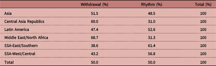 The near equal proportion of tradition method users who rely on rhythm versus withdrawal. Currently, rhythm and withdrawal account for 50% each of total traditional method use level, consistent with the findings in a 2013 review that the two were nearly equal in extent of use (Darroch & Singh, Reference Darroch and Singh2013). However, there are large regional and country disparities in the use of one over the other. Since the 1970s, researchers have explored reasons for these differences. Rhythm is often more common than withdrawal among couples with higher education levels due to the complexities of tracking fecundity during the monthly cycles (Caldwell et al., Reference Caldwell, Gaminiratne, Caldwell, De Silva, Caldwell, Weeraratne and Silva1987; Goldberg & Toros, Reference Goldberg and Toros1994; Lesthaeghe, Reference Lesthaeghe2010). There is significant variability in rhythm users’ understanding of how to effectively practise rhythm, due to lack of knowledge about reproductive physiology (Maynard-Tucker, Reference Maynard-Tucker1989), lack of knowledge of individual variation in menstrual cycles (Mastroianni, Reference Mastroianni1974) and inability to identify fertile days (Logarta-Avila, Reference Logarta-Avila1985; Sheon & Stanton, Reference Sheon and Stanton1989; Becker & Costenbader, Reference Becker and Costenbader2001; Shahina et al., Reference Shahina, Nand, Suneeta and Arvind2013). Withdrawal is free from these problems and has a long history in certain regions, but it requires a special discipline on the part of the male partner.