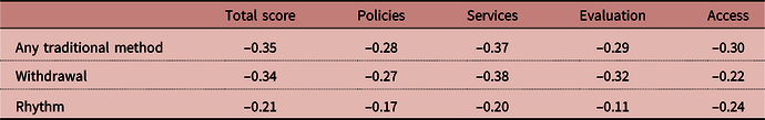 To test this hypothesis, the association was tested between the Family Planning Programme Effort Scores that measure the strength of programmes across four dimensions (policies, services, evaluation and access) and the share of total use corresponding to traditional methods. Table 6 shows the correlation matrix between the Family Planning Programme Effort Scores (total score and the four sub-scores) matched to the share of use for any traditional method, withdrawal or rhythm.