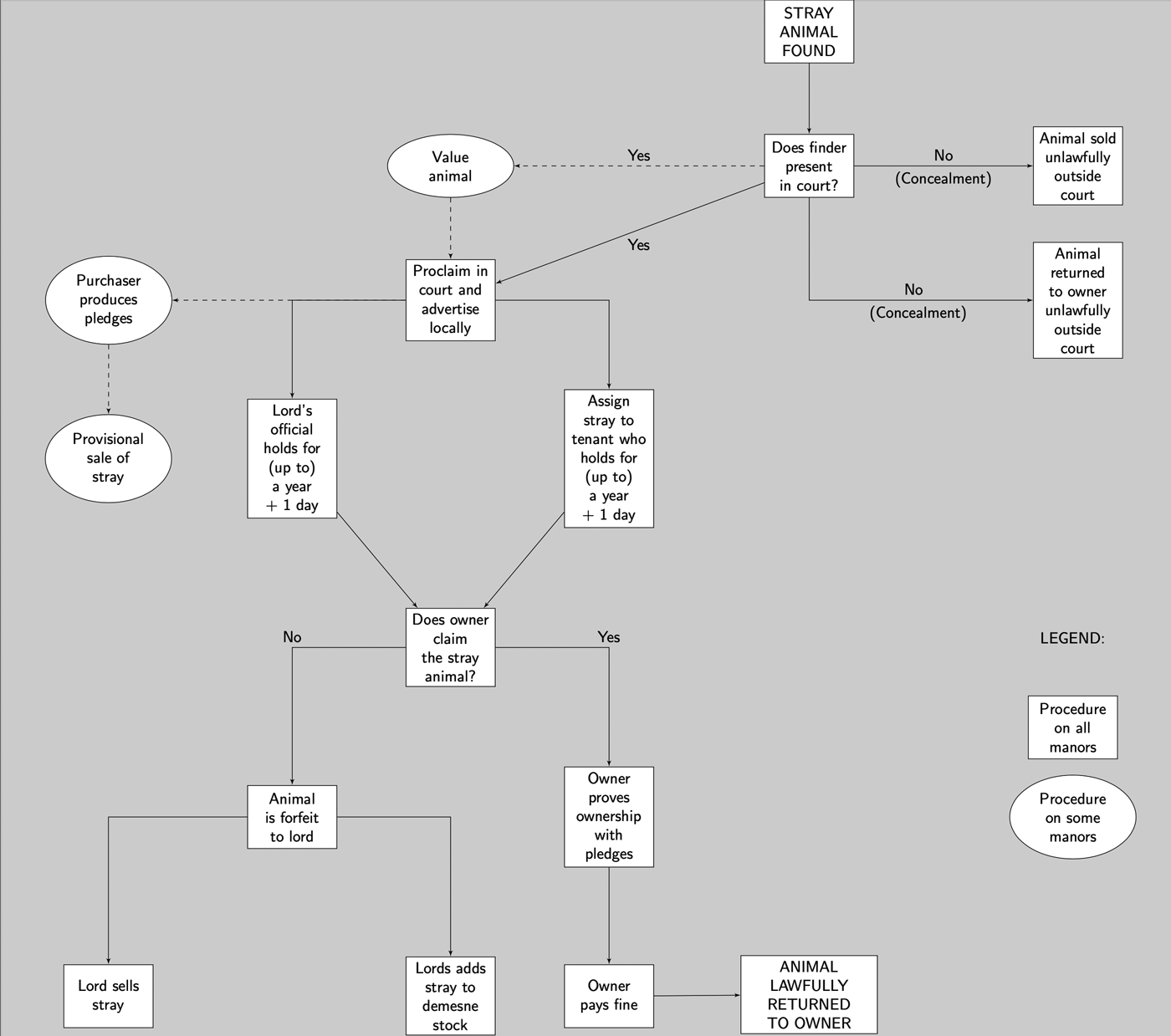 The stray system had four fundamental stages. If the most direct route was followed, a stray was found, presented in court, advertised to neighboring communities, and finally either claimed by its owner or, if unclaimed for year and a day, forfeit to the lord. There were, however, a number of local peculiarities on any given manor as well as multiple opportunities for individuals to try to cheat the system. Both factors could complicate the process. In all cases, the aims of the stray system seem to have been remarkably similar; the core idea was to ensure that the process was sufficiently public and transparent so as to give the owners of lost beasts ample opportunity to find and reclaim them. In this section, we reconstruct the complex processes of the stray system, illustrated in figure 1, as it was administered by manor courts.