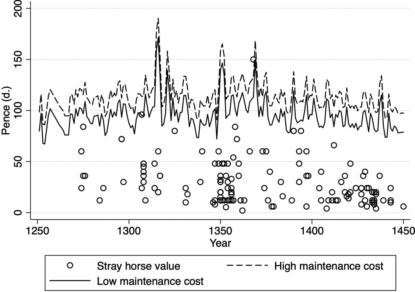 Taking all these elements into account, we have created two maintenance cost estimates for every year between 1250 and 1450, a high estimate that includes all the components discussed above, and a low or bare-bones estimate that only includes fodder costs and is basically the amount required to simply keep an animal alive. The specific composition of each estimate and the relevant methodological concerns are described in Appendix A. These are illustrated, along with discrete values of individual stray horses, in figure 3. Over the two centuries from 1250 to 1450, the average cost of maintaining a horse for 366 days would have been around 115d. at a high level and 102d. at the bare-bones level of subsistence. As our maintenance estimates are driven by fluctuating grain prices, maintenance costs were substantially higher in the famine years of 1315–1317 and following the Black Death in 1350–1352. A third spike is observed in 1369, which Bruce Campbell has attributed to a “combination of dearth and plague” in a period of bad harvests and recurring plague episodes.Footnote 124 In any event, the cost of maintaining a stray horse was centered around 100d., or 8s. 4d., for most of our period. That amount would have been equivalent to forty days’ wages for a semi-skilled worker, such as a thatcher, in 1300 when such a job paid 2.5d. per day, or twenty-two days’ pay in 1400 when wages had climbed to 4.5d.Footnote 125