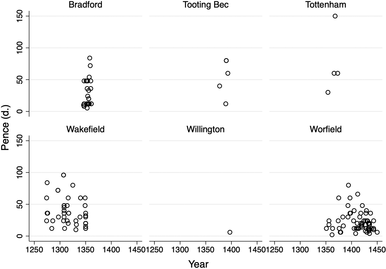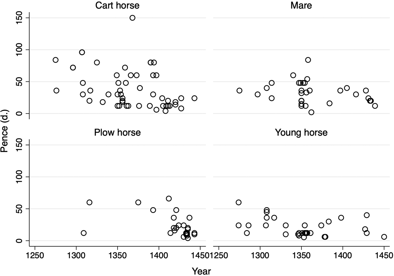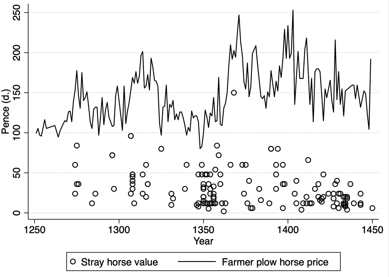 Figure 4 plots the values of stray horses in our sample against the average national price for plow horses, as compiled by David Farmer.Footnote 130 It is immediately apparent that the values of the strays in our sample were not only significantly less than the annual cost of their upkeep but also much lower than cost of the average plow horse. How can we explain the persistently low values of these animals? The most obvious reason is that they were simply of low quality. Many examples from the court rolls support this conclusion. Stray horses were often described as “infirm,” “disabled,” or “debilitated,” and in 1331 the clerk at Wakefield noted that a foal was sold for 10d., a price that was “so little because [the foal] is of no value.”Footnote 131 Similar indications of low quality can be found for other animals, with a range of other beasts also described as “debilitated” as well as “lame” and “weakened.”Footnote 132 Indeed, the jury at Worfield noted a sheep had been valued at 4d., “and not more because [it is] debilitated.”Footnote 133 More colorful examples include a pig at Wakefield described as “leprous”Footnote 134 and a bull at Bradford as “insane.”Footnote 135 The low quality was potentially a selection effect. Owners may have released worthless or diseased livestock rather than going to the bother of slaughtering them, or at least expended little effort to recapture such low-quality animals if they escaped.