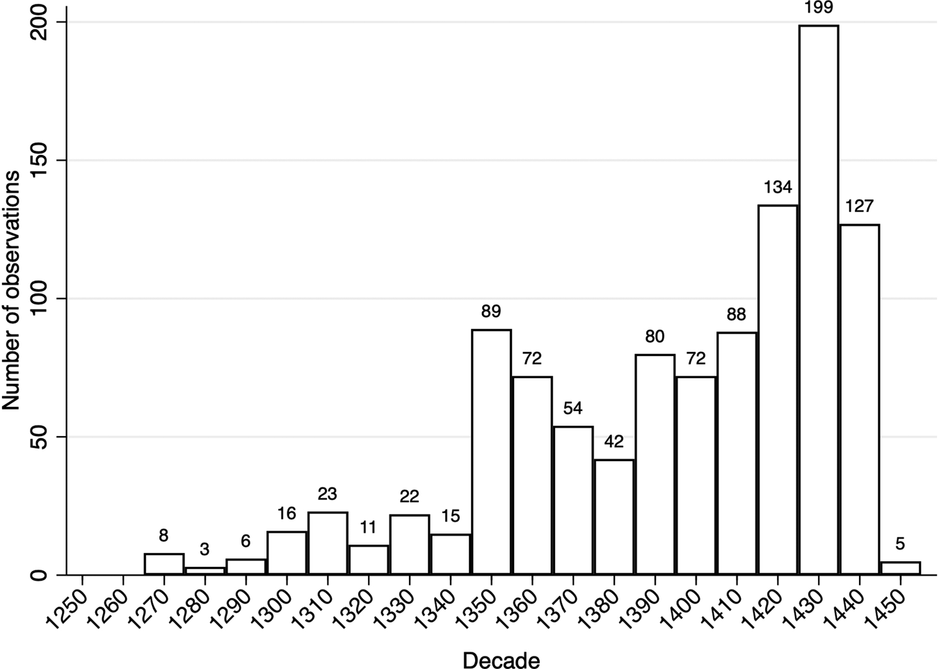 The empirical basis for this article rests on a corpus of 1,066 observations of stray animals based on a sample of manorial court rolls spanning the years 1274 to 1453 and containing a total of 1,781 court sessions. As table B1 illustrates, these sessions are drawn from nine different manors. The sample is not balanced, with the core manors of Worfield and Little Downham making up a large proportion of the total observations of strays. Similarly, there is a bias toward the post–Black Death period, with the majority of observations coming from the 1350s onward, as seen in figure B1.