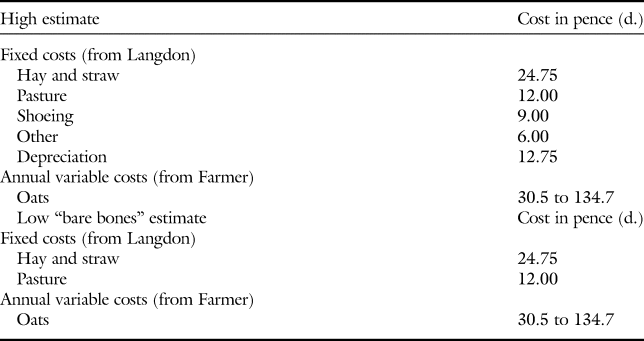 We attempt here an estimate of how much it would have cost to maintain working horses in late medieval England. As discussed in the text, many variables are involved in such an estimation, but we have a wealth of data from which to judge the matter.