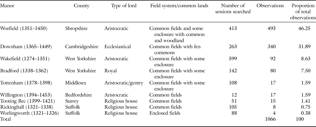 Our analysis, below, of the stray system at the manorial level, is based on 1,066 observations of strays systematically drawn from surviving court rolls of nine manors across medieval England.Footnote 57 Little Downham in Cambridgeshire, Wakefield in West Yorkshire, and Worfield in Shropshire were chosen because their court rolls survive in large numbers over long periods of time. Located in the North, the Midlands, and East Anglia, and with both ecclesiastical (Downham) and aristocratic (Wakefield and Worfield) lords, these manors give the study breadth in terms of both geography and lordship. These manors have been supplemented by shorter series of rolls from other manors from the Thames Basin region, which include manors held by the crown and religious houses.