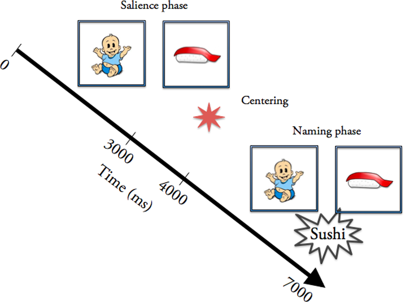 Figure 1. Trial structure. The 0–3000 ms time interval is the salience phase, whereby a pair of familiar target picture and unfamiliar distractor picture is shown. It is followed by the 3000–4000 ms centering phase, whereby a flashing star is shown. This is in turn followed by the 4000–7000 ms naming phase, which presents the same pair of pictures accompanied by a label.