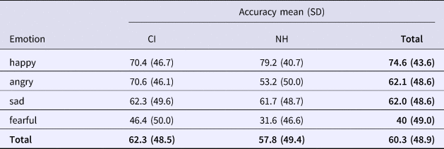 First of all, as for emotional prosody perception, Volkova, Trehub, Schellenberg, Papsin, and Gordon (Reference Volkova, Trehub, Schellenberg, Papsin and Gordon2013) found that five- to seven-year old implanted children discriminated happy and sad utterances with a score above chance but less accurately than NH peers. Children with CIs aged between seven and thirteen years in Hopyan-Misakyan et al. (Reference Hopyan-Misakyan, Gordon, Dennis and Papsin2009) performed worse than NH peers when identifying the emotion (happy, angry, sad, fearful) of emotionally pronounced variants of semantically neutral sentences, but the two groups performed equally on affective facial recognition, showing that difficulties with vocal emotion recognition could not be explained by more general delays in emotion understanding. In a study by Luo et al. (Reference Luo, Fu and Galvin2007), adult recipients’ scores were poorer than those of a NH control group when identifying the emotion (happy, angry, sad, fearful, or neutral) of sentences. These studies show that CI recipients of various ages have difficulty identifying emotions in speech.