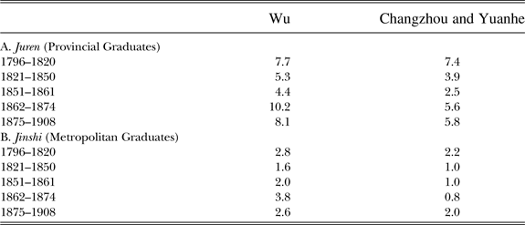 In much of China, local elites are thought to have preferred country estates to urban compounds. In Suzhou, however, landlords had long since moved into the city or to one of the prefecture's more picturesque market towns. In the post-Taiping era, they relied on rent bursaries backed by official power to collect their rents even as they, if not their tenants, benefited from reductions in the area's notoriously heavy land tax quotas.Footnote 97 The second most successful prefecture in terms of examination graduates in Qing,Footnote 98 Suzhou had an unusually large number of retired officials in residence. It continued (even exceeded) its early nineteenth-century levels of success in the post-Taiping era (see Table 1). And it benefited from post-Taiping expansion of quotas for the lower degree: between 1811 and 1850, enrollment in the three district schools at Suzhou fluctuated between 374 and 470; in the decades 1861–90, this rose to 683–764.Footnote 99