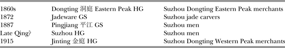 Sources: Fan Jinmin, Ming Qing Jiangnan shangye de fazhan, 287–301; Wang Weiping, Ming Qing shiqi Jiangnan chengshi shi yanjiu, 190–92, 210–21. Note that the distinction Johnson tried to make between Trade Associations and Sojourner Lodges has been rejected by most other scholars, who have noted that the terms are often used interchangeably in the sources. See Zhang Zhongmin, “The Civil Role of Sojourner and Trade Associations in Shanghai during the Qing Period,” in Dragons, Tigers, and Dogs: Qing Crisis Management and the Boundaries of State Power in Late Imperial China, edited by Robert J. Antony and Kate Leonard (Ithaca: Cornell, 2002), 108–11.