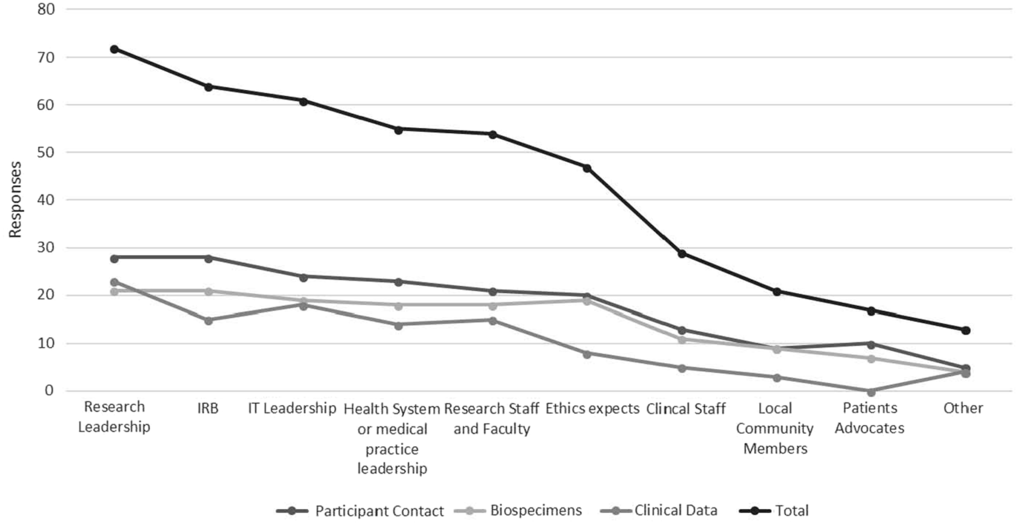 Hub respondents with ongoing policy work in each of the three domains were asked to provide information signifying key informants and drivers of broad-scale informed consent policies and practice at their institution. Figure 1 depicts these data in line graph formation to highlight the relative importance of various informants/drivers across all domains. “Other” responses identified compliance and legal personnel as primary drivers.