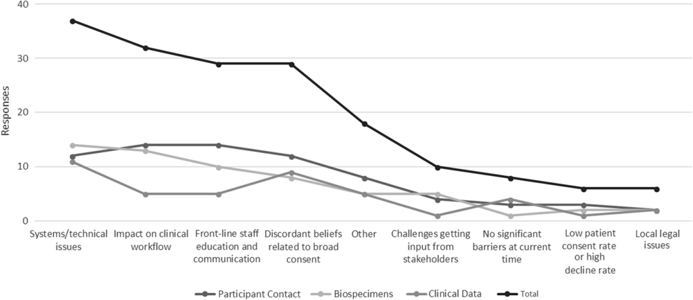 Lack of system/technical implementation workflow was commonly cited as a barrier to broad-scale informed consent implementation. Based on survey results, systems support for EHR clinical workflow, patient portals, and/or clinical trial management systems are used to support consent tracking and patient preferences. Hubs indicated barriers to tracking participant decisions, effective stakeholder engagement, and education of both investigators and participants.